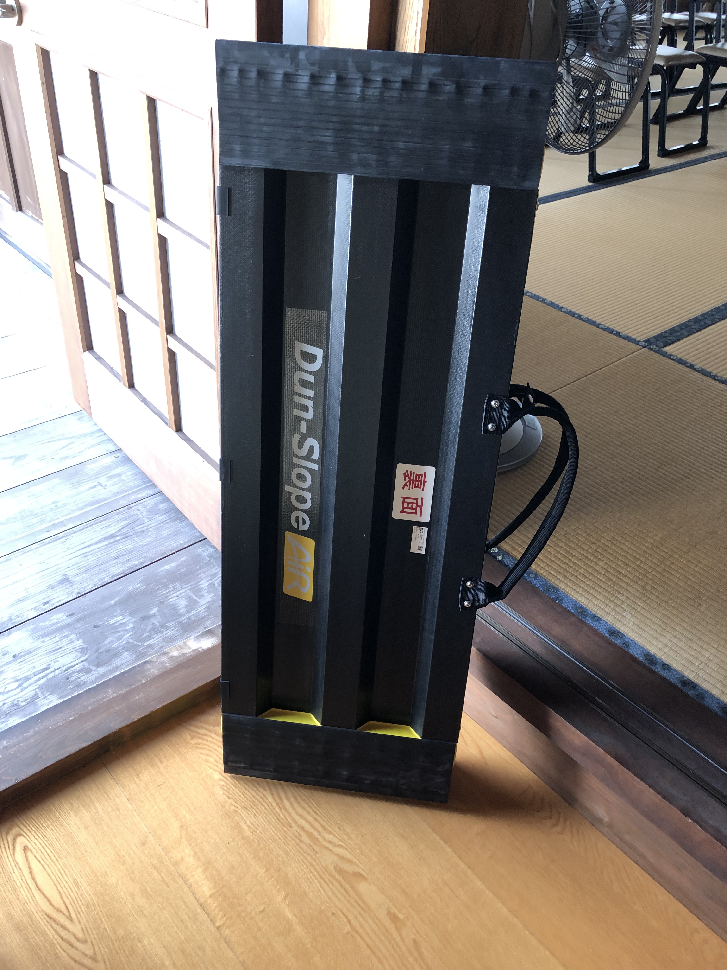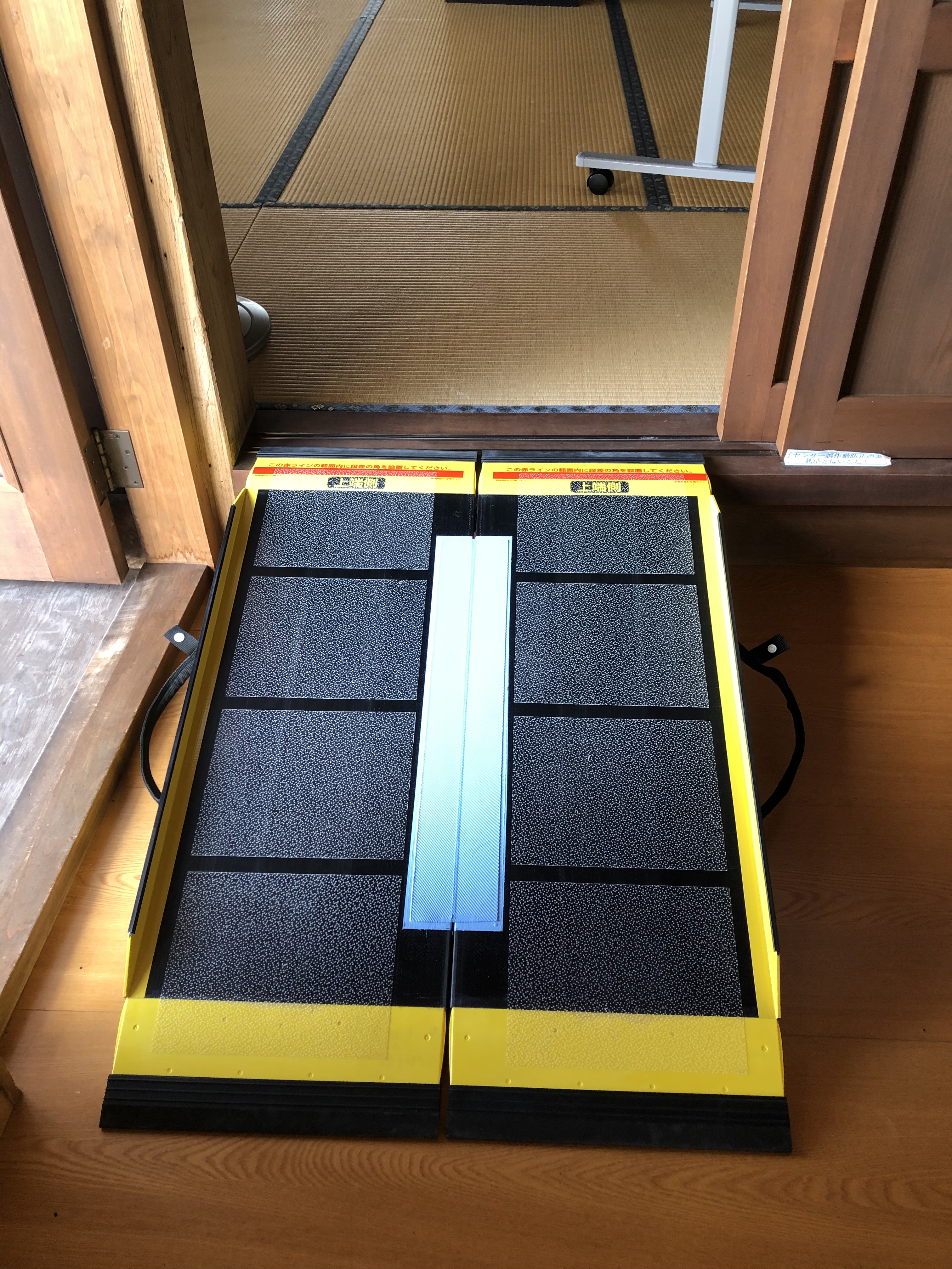 本堂への入り口には持ち運び式のスロープを設置しました。とても軽くてコンパクトです。150キロまでは大丈夫とのこと。