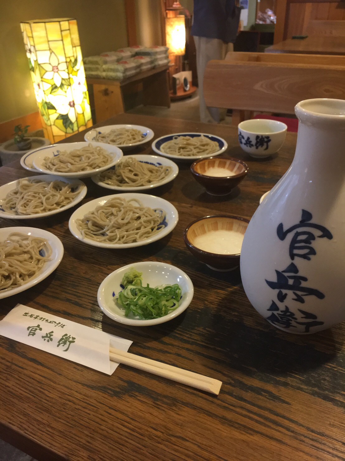 そばは信州からお殿様の国替えとともにこの地に伝わったのだとか。小皿で供され、塩、わさび、ネギ、卵、とろろなどさまざまな薬味で楽しむのが出石そばのスタイルのようです。