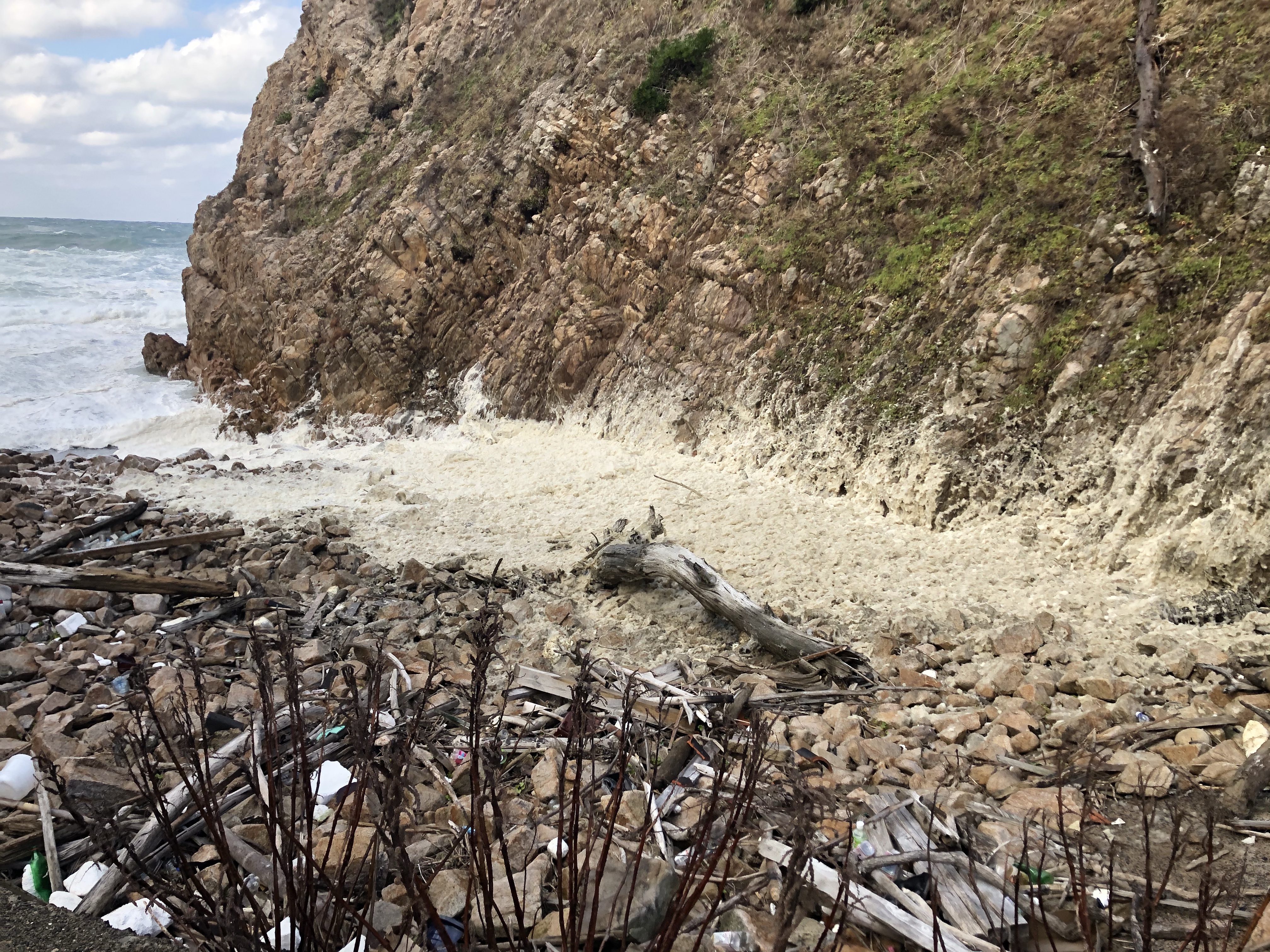 海岸を眺めると、岩場の波打ち際に波の花が舞っていました。海中にただよう植物性プランクトンの粘液が冬の荒波にもまれて、白い泡となったのが波の花です。黄色になっていたので、できてから時間が経っているのかもしれません。