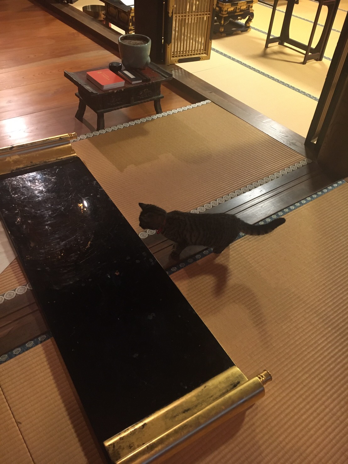 土曜が仕事納めで、気づけば明日は大晦日…ということで、住職の朝のお勤めに1人と1匹ついていき、本堂のお飾りを迎春モードに整えました。