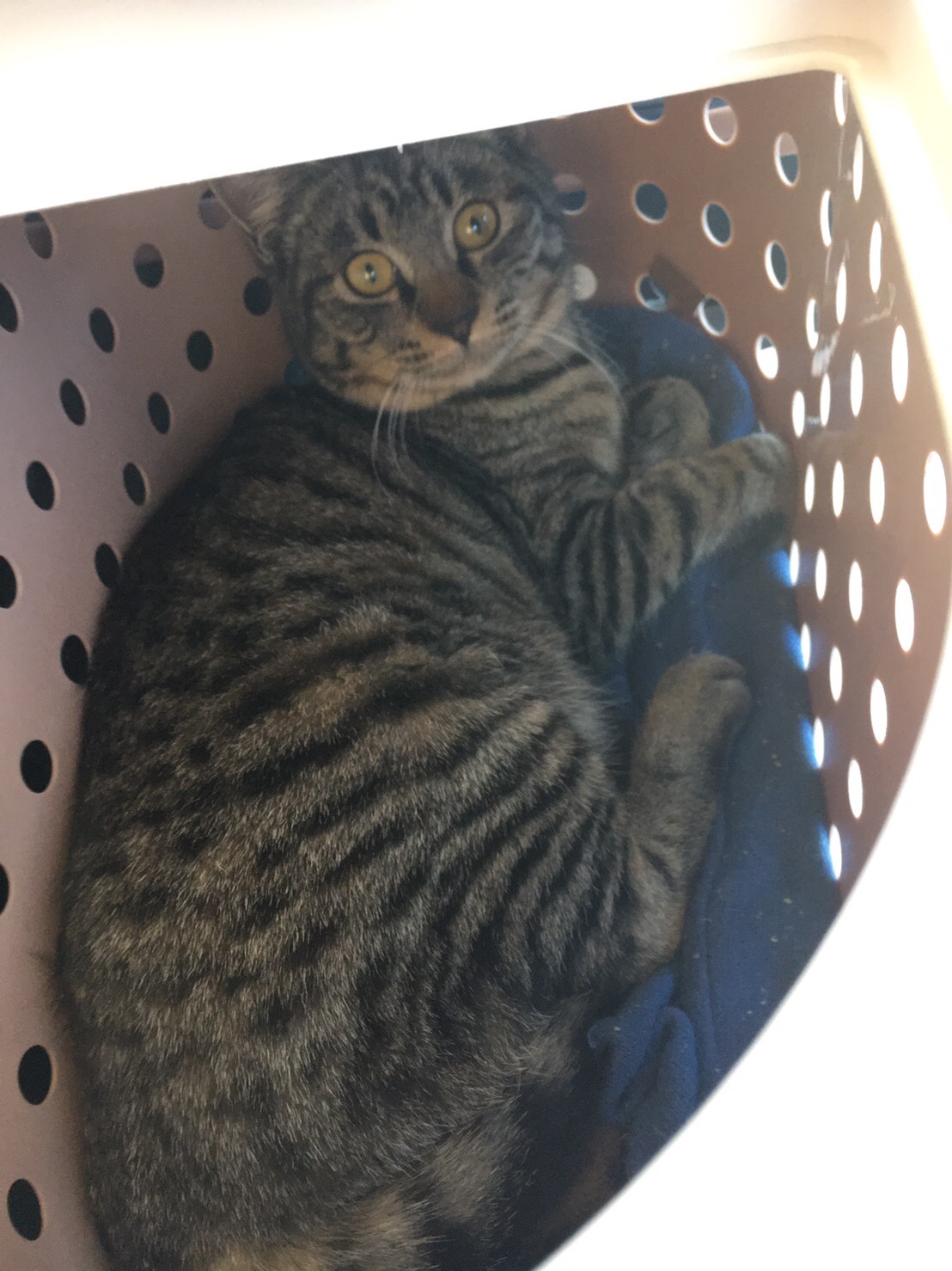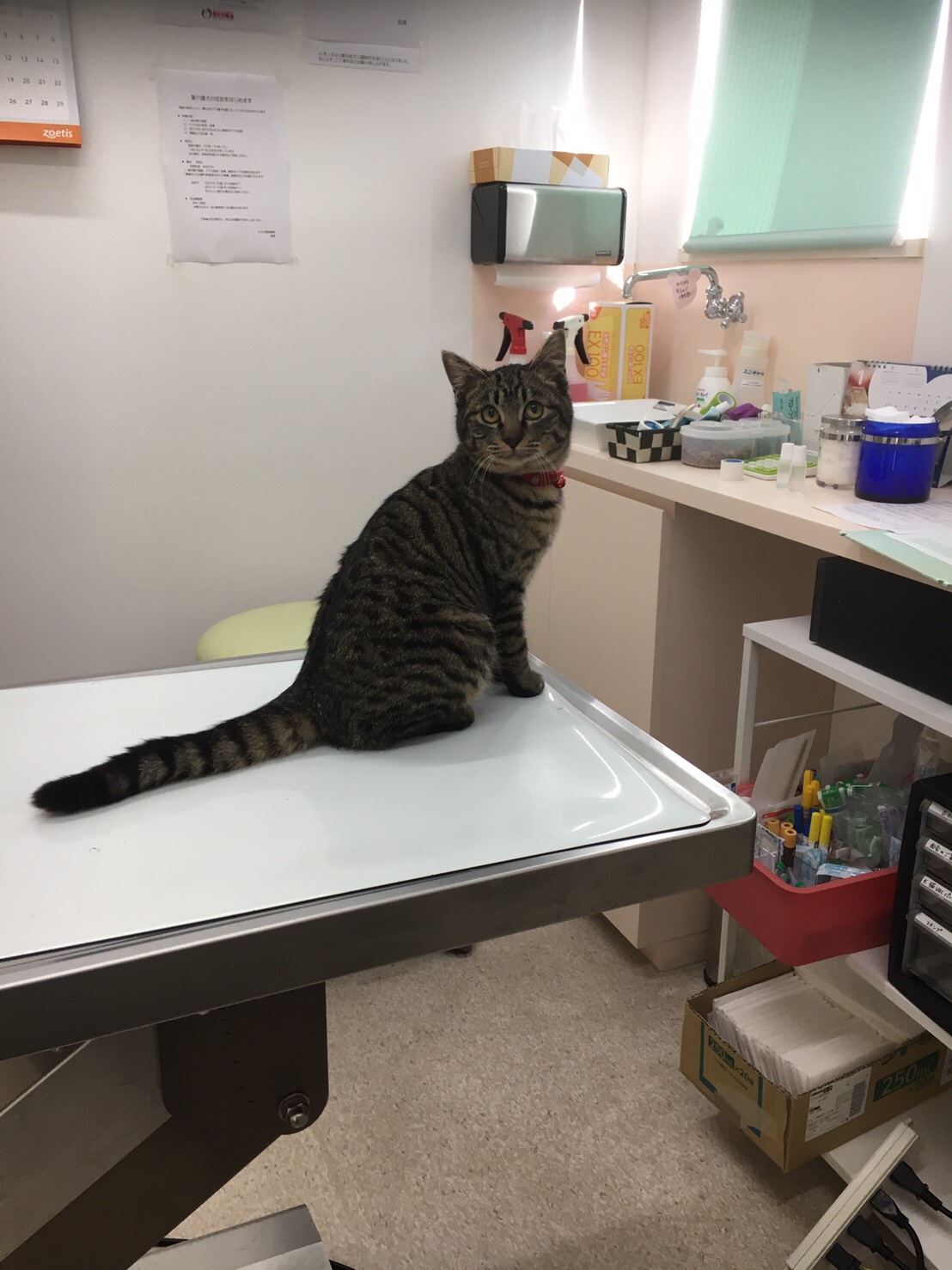 「やまなさーん」とよばれたら、バスケットからだされました。おんなのひとが、おなかやせなかをさわって「やせてもふとってもいませんね」といいました。もういやだったので、じぶんでバスケットにはいりましたが、またひっぱりだされました。