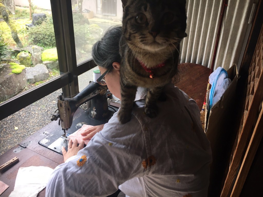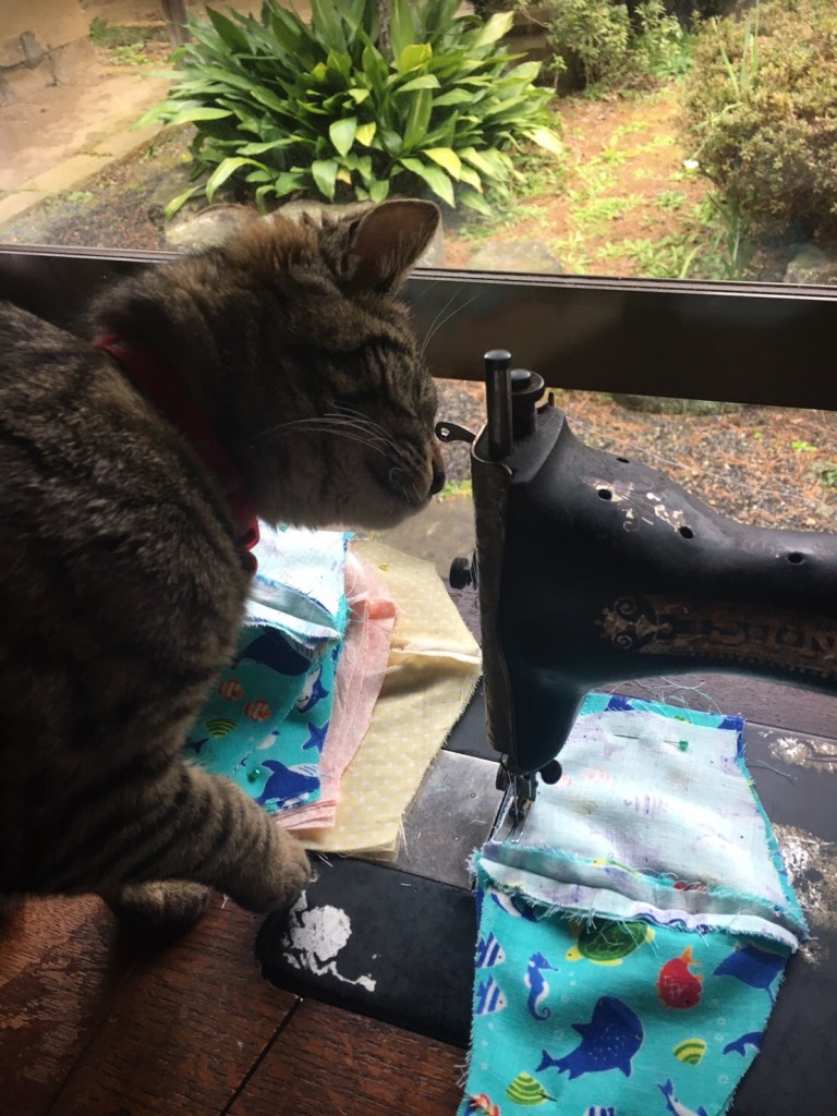店頭からマスクが消えていることを住職がボヤきますので、半ドンで帰宅後、縁側が明るいうちに、先日に引き続き、古ミシンを相棒に、布マスク生産にとりかかりました。