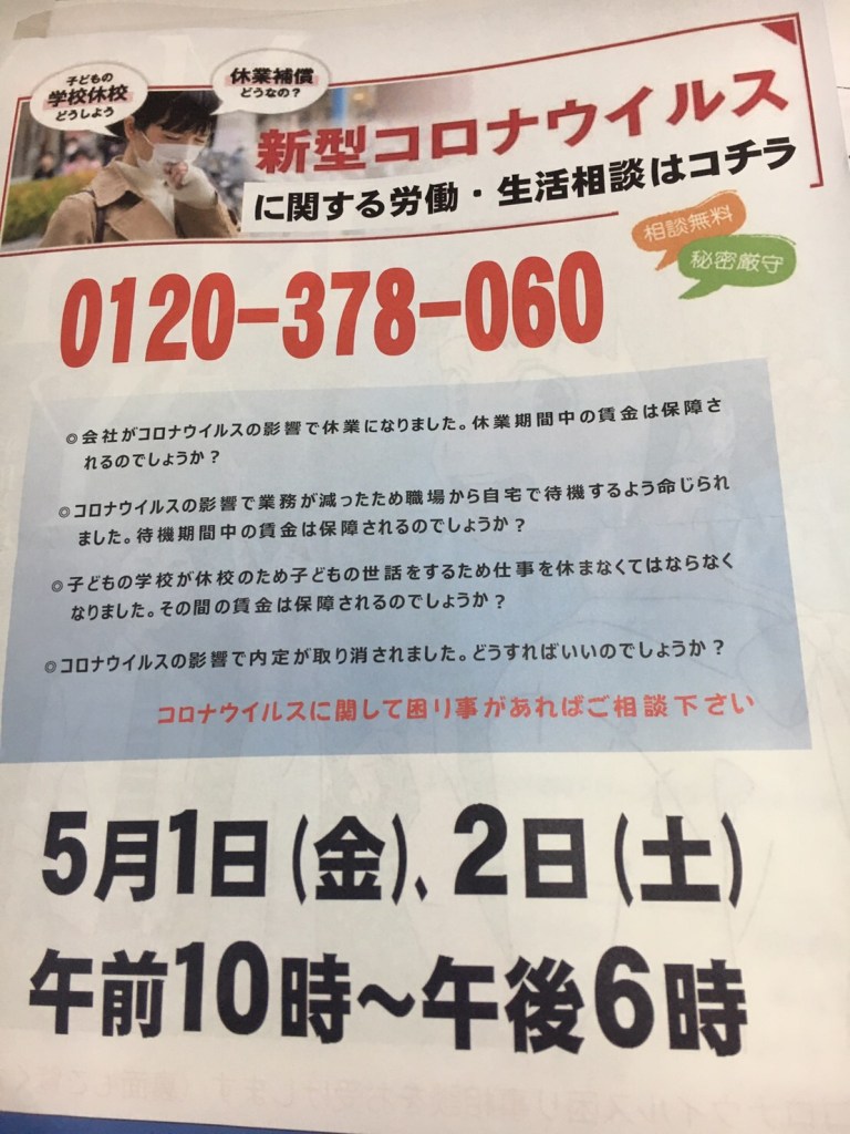きょうは「メーデー」100周年らしいですが、こんな時なので中止。かわりに、鳥取県内ではコロナ電話相談が明日まで持たれます。