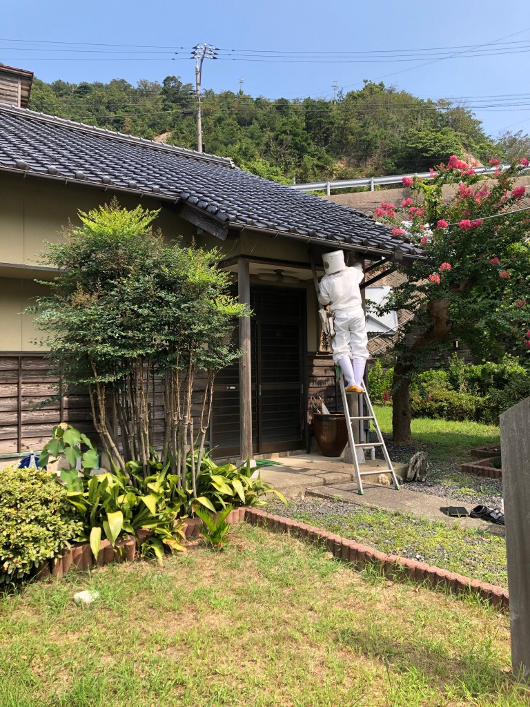 業者さんは防護服を着込んで作業にあたりました。これだけ防護しても刺されることがあるそうです。「蜂のひとさしというのはミツバチだけで、スズメバチは何度も刺してくるから危険です」とのこと。スズメバチは周期的に大発生する年があるそうです。