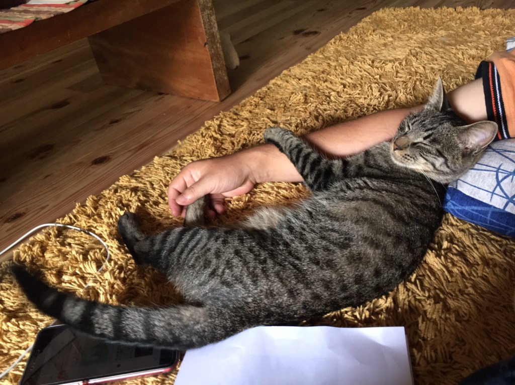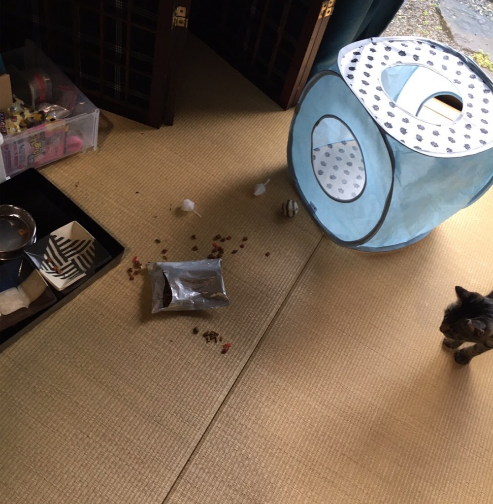 このまえのよなかは、おなかがペコペコだったので、ごはんのはいっているひきだしをあけて、そのなかにあった、カリカリのふくろをひっちゃぶいて、たべてやりました。