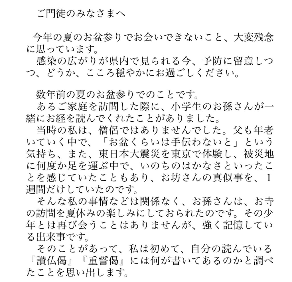 10日ほど前にご門徒さんのところに届けたお手紙をブログでも紹介します。来年はこのようなことにならなければよいのですが。