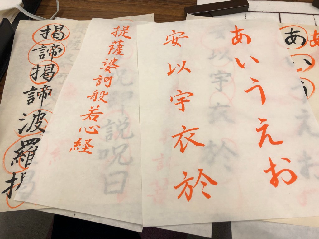 習字教室は『般若心経』がきょうで終わり。心が清浄になったかどうかは定かではありませんが、さまざまな漢字を書き、先生の手本をいただき、網代のおばちゃん方との交流も深まり、楽しいひとときでした。
