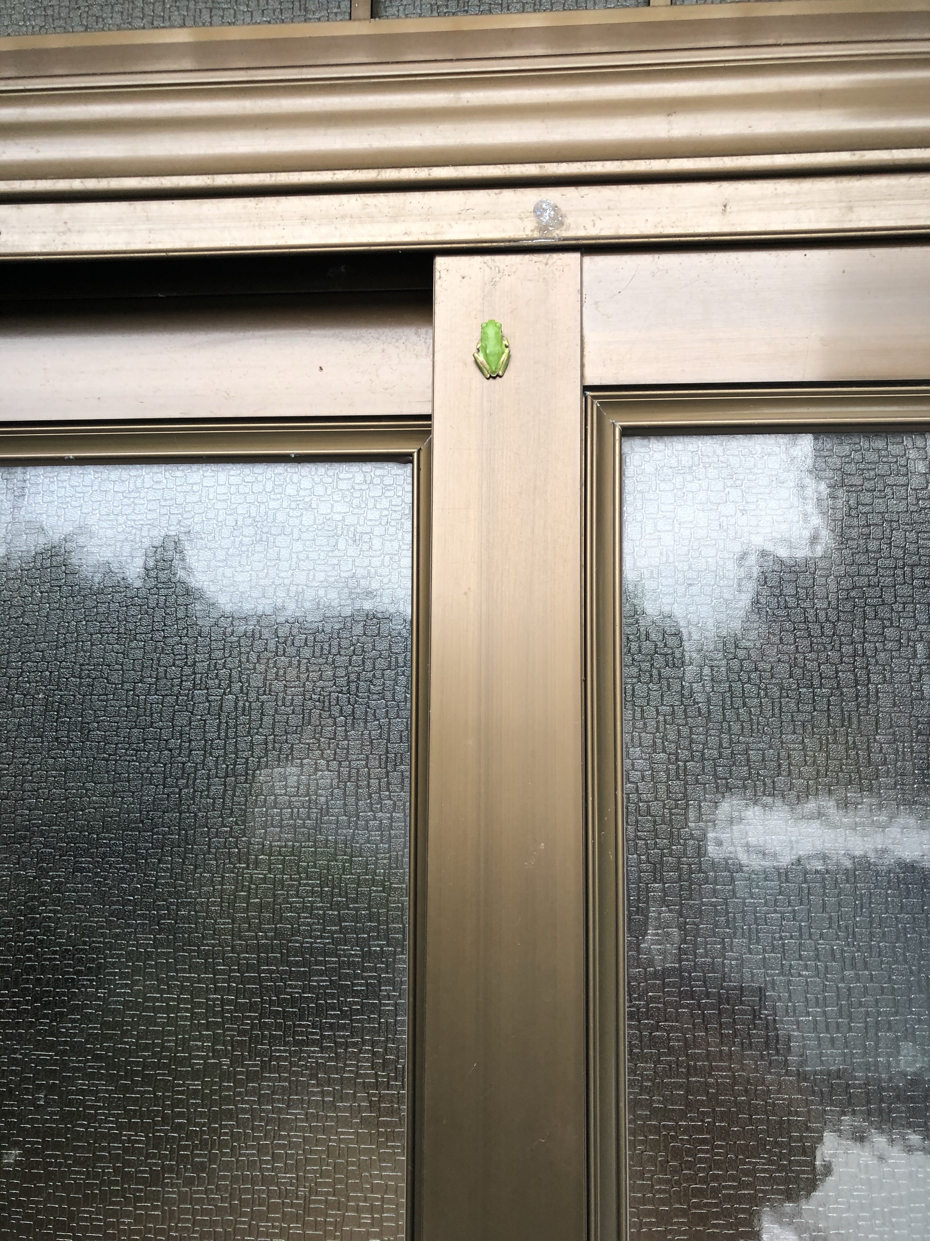 きょうは雨が降ったり止んだりの1日です。家にかえるとアマガエルくんが玄関サッシで一休みしています。