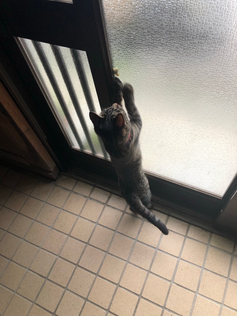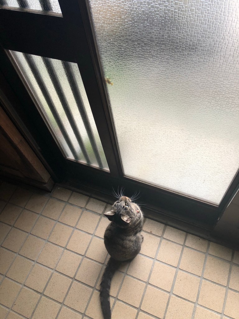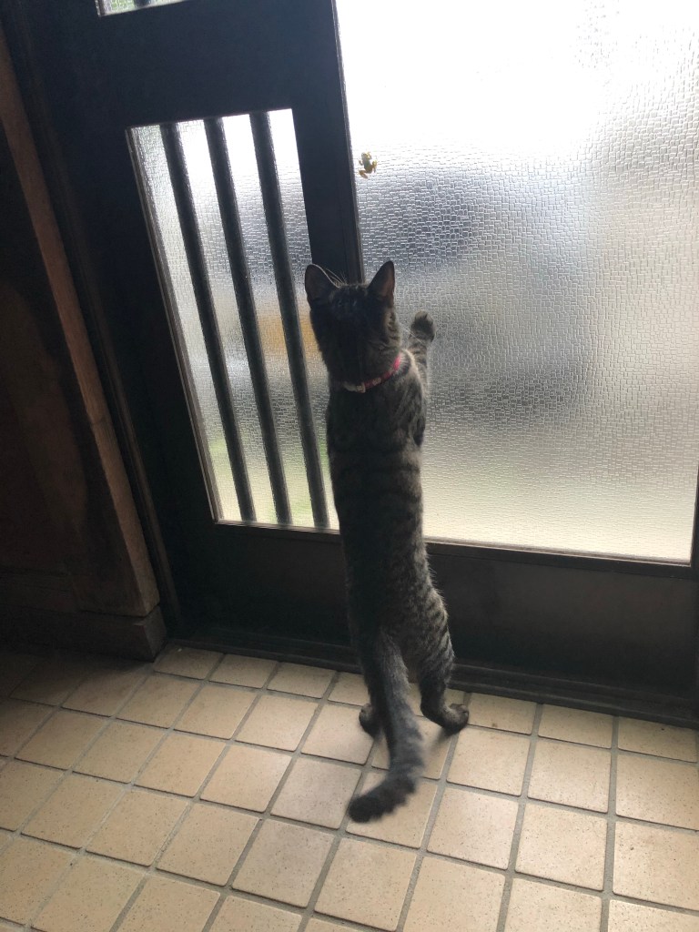 しばらくするとナモは玄関の土間のところに。しきりにサッシを叩いています。