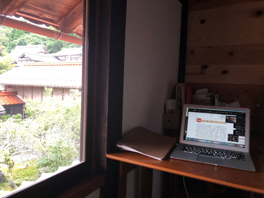 庭もお寺も見えて、いい眺めです。ということに、いま初めて気がつきました。ここにお客さんを招いて本でも読んでもらったらいいかもしれません。