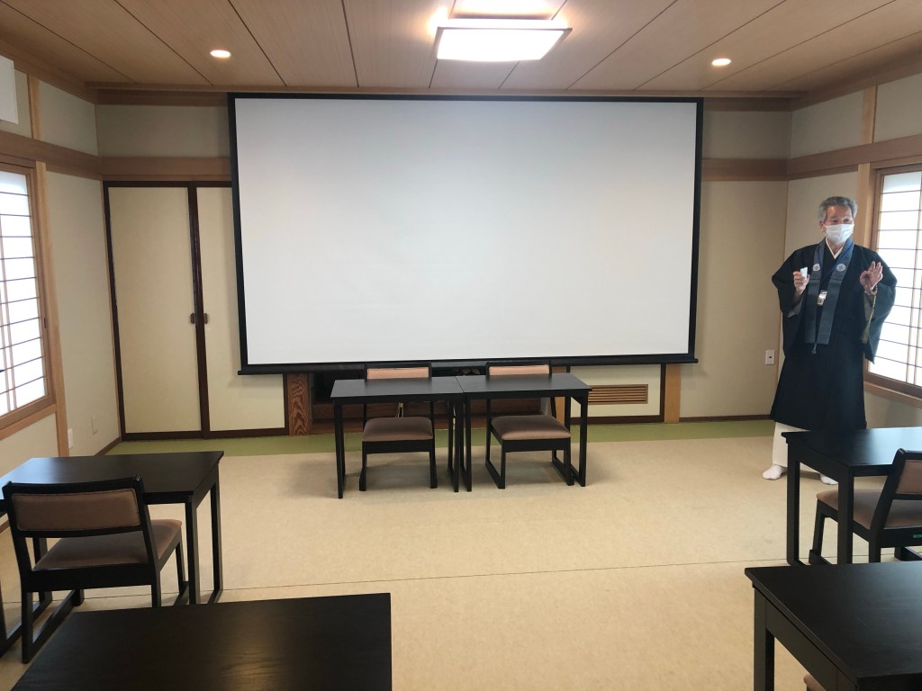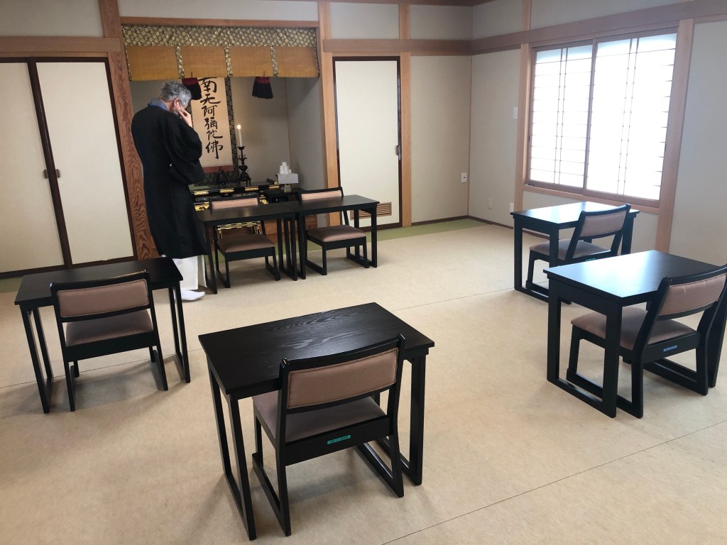 門徒会館は、お通夜ができる施設です。霊柩車が玄関先につけて台車に棺桶をのせ、そのまま御本尊のところまで運ぶことができるそうです。また、ご遺族が宿泊できるようになっています。葬儀は本堂でお勤めされ、門徒会館からもお参りできるようにスクリーンも設置されています。