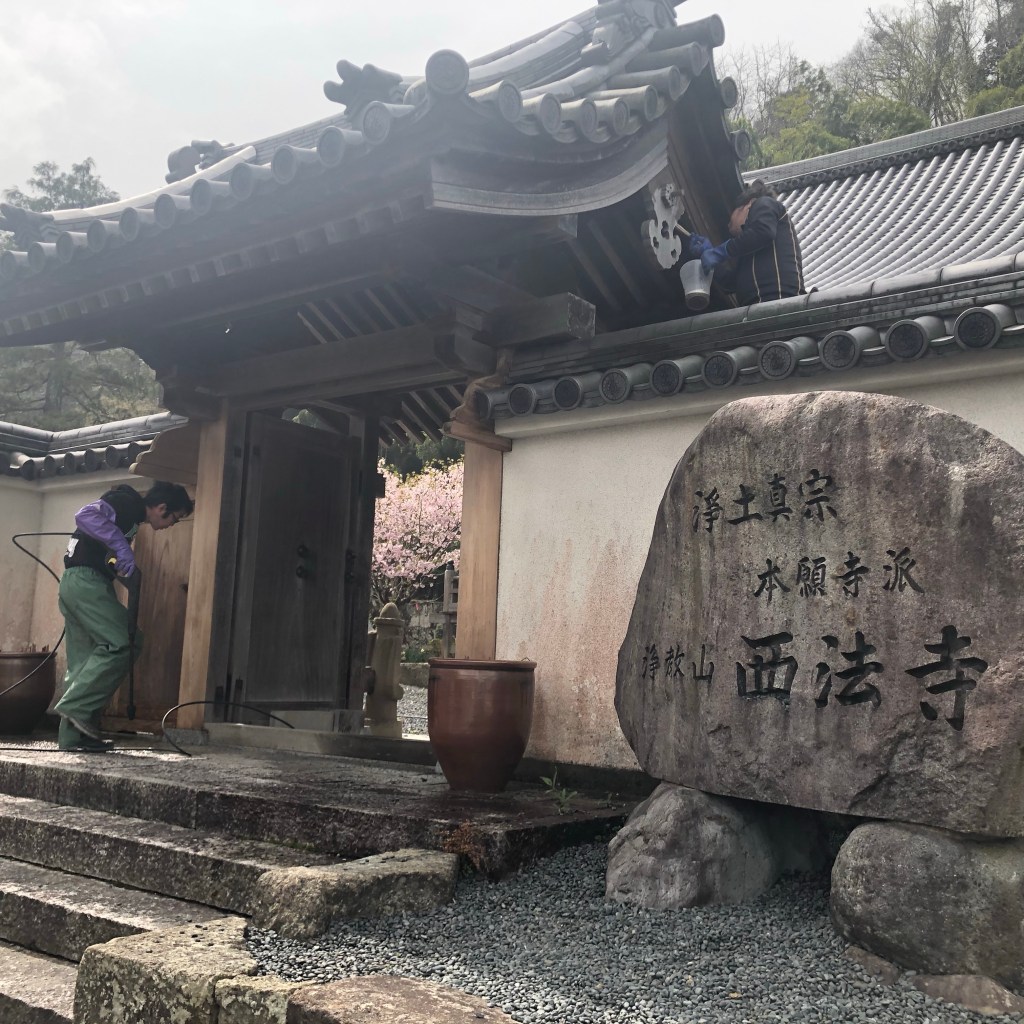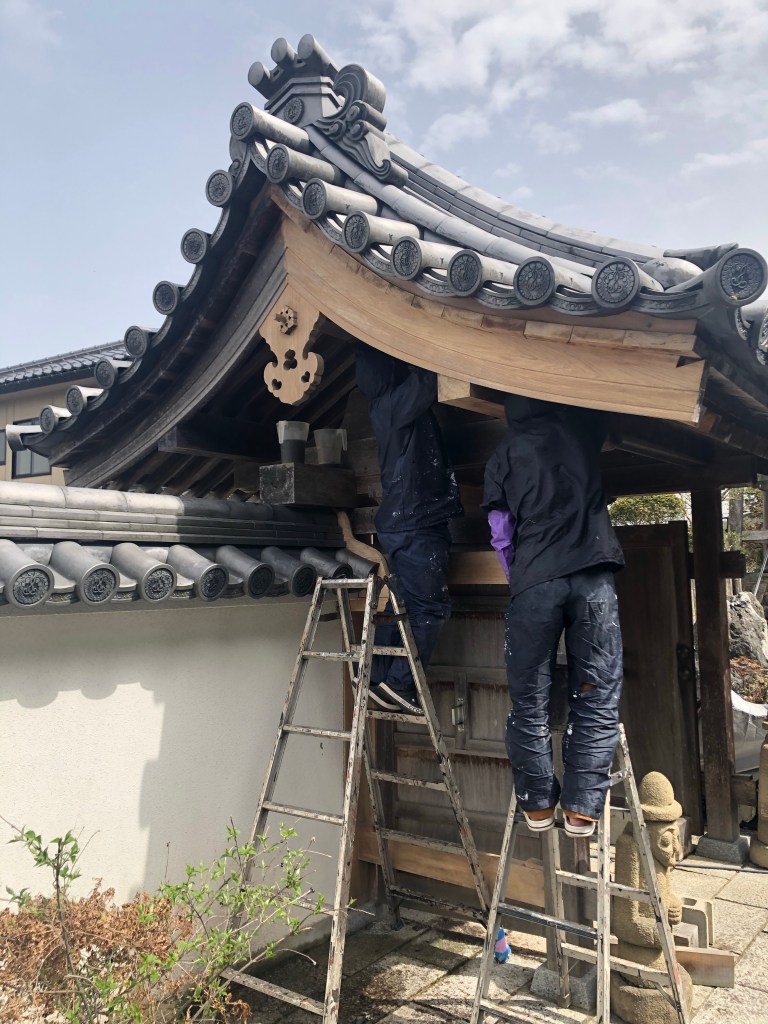 お寺の山門が、赤いカビで汚れが目立つようになりました。先日の役員会でも汚れを落とすことを報告したのですが、きょうから大工さんに作業していただいています。