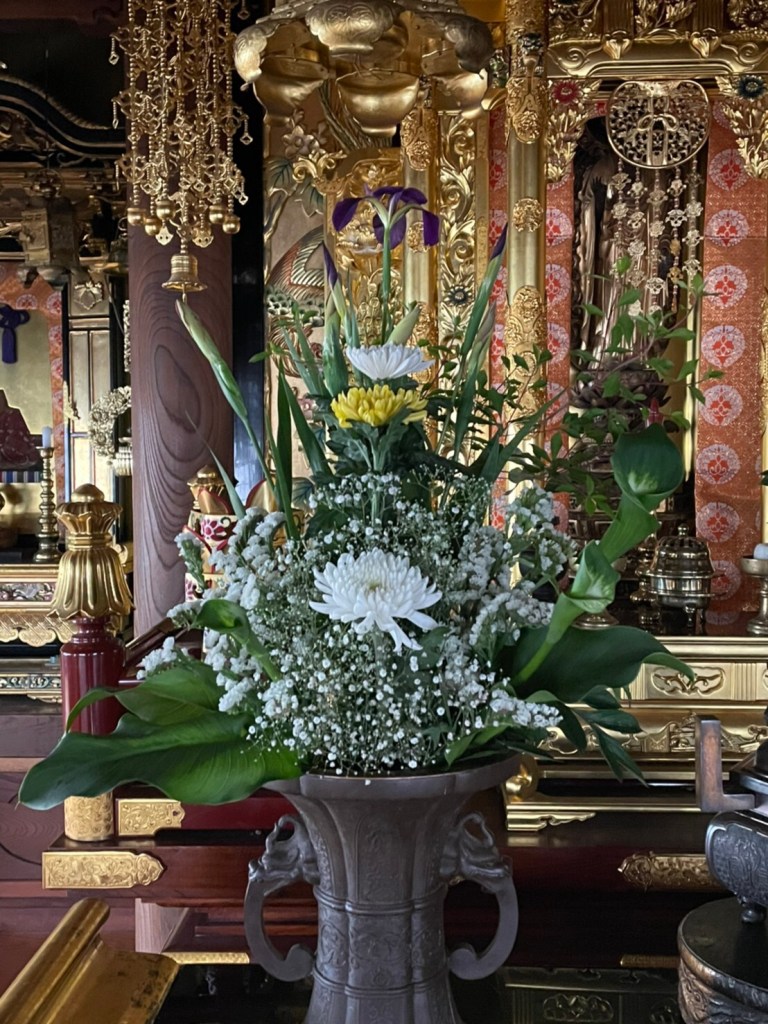 本日、葬儀を勤め、その後、ご遺骨を前にお寺でお勤めする還骨法要です。これまで、お寺をこれまで護持していただいたことに感謝申し上げるとともに、これからいよいよ仏さんとして導いてくださいと頭を下げる気持ちでお勤めしました。