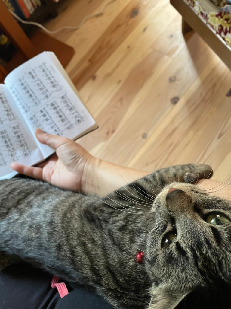 ナモちゃんも、おばたんといっしょにお経の練習かな?