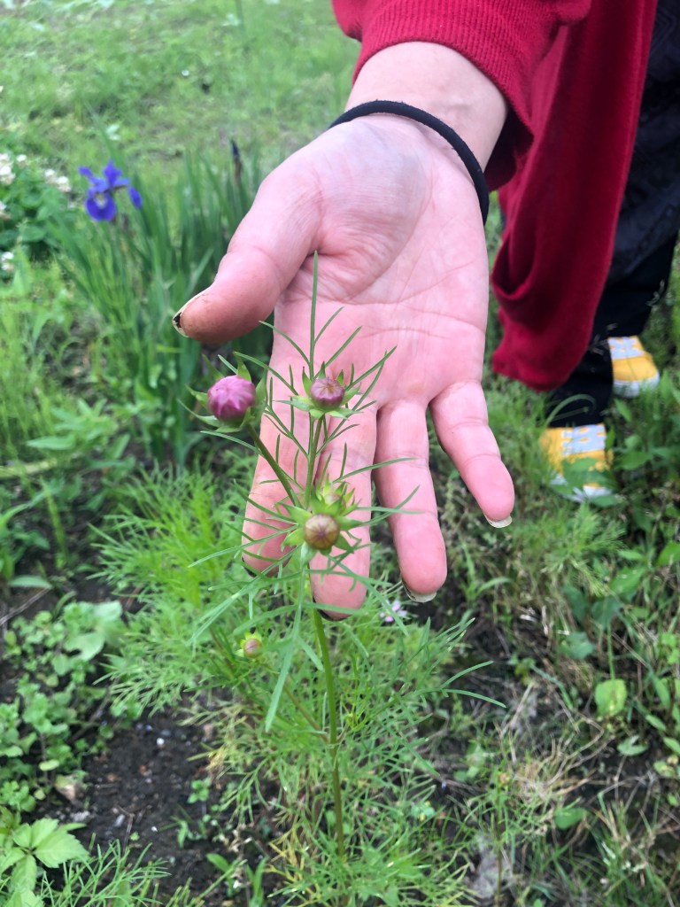 西法寺農園に目をやると、秋に咲く秋桜が咲こうとしています。アレっいつの間に? 今年植えたのではありません。去年の秋口に種を蒔いたコスモスが晩秋に咲きました。その種から芽が出て、まさに花を咲かせようとしています。季節は早いですが、キレイな花をつけてくれるかな。