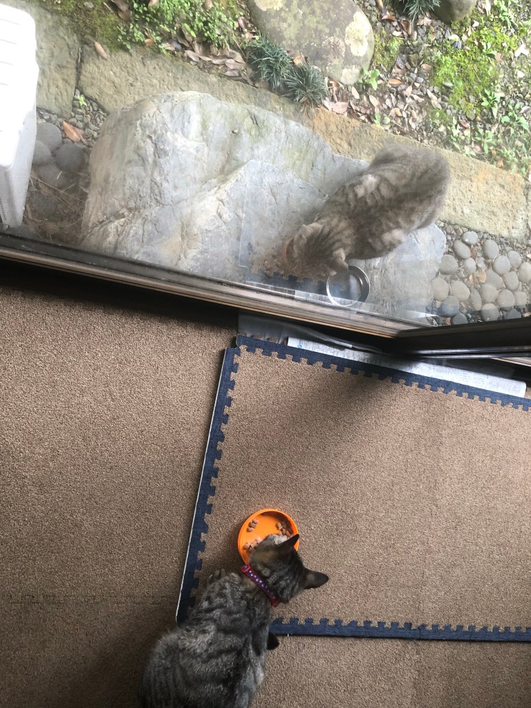 野良猫シマ氏用のご飯を分けてもらい、内と外で仲良く食べているではありませんか。