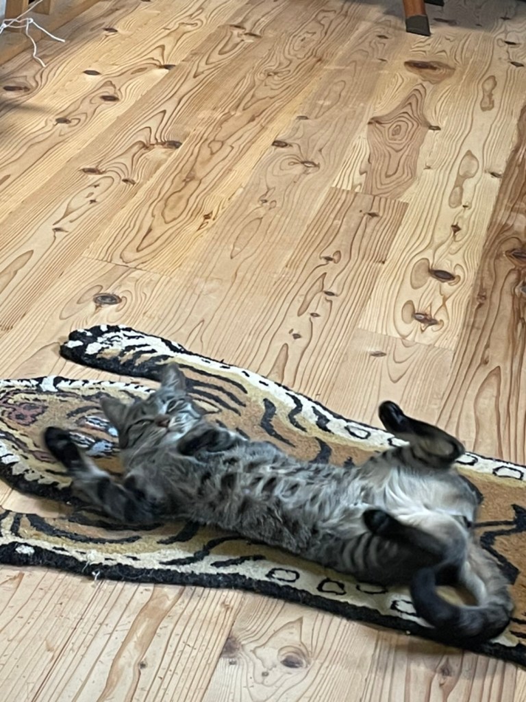 2者はいい遊び仲間ではありますが、ナモは毎晩、私の掛け布団の上の足の間の凹みに埋もれて寝ているのです(おいたんの布団にはだいたいお漏らしをするので出入り禁止中)。