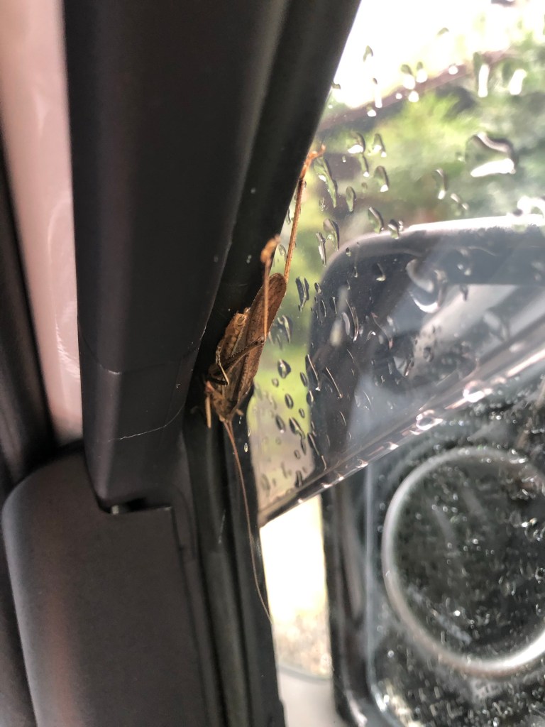 今日も雨降りです。火葬場でのお勤めが終わり、お寺まで車を走らせていたら、車の雨よけカバーにバッタが一匹ついています。
