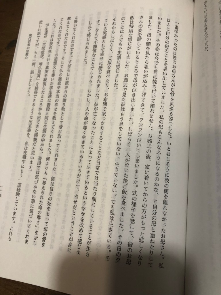 その学びの最中に、一人のゼミ生が自死するという痛ましい出来事に直面するのです。浅田さんとゼミ生は葬式に参列します。そこで、息子さんの頬をずっと撫でているお母さんの姿がゼミ生たちの胸を打ち、命について真剣に向き合うことになるのです。