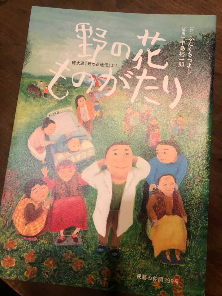 午後、劇団民藝の公演『野の花ものがたり』を観てきました。舞台は鳥取市内にある野の花診療所のホスピス病棟。モデルは同診療所の徳永進医師です(劇中では徳丸進医師)