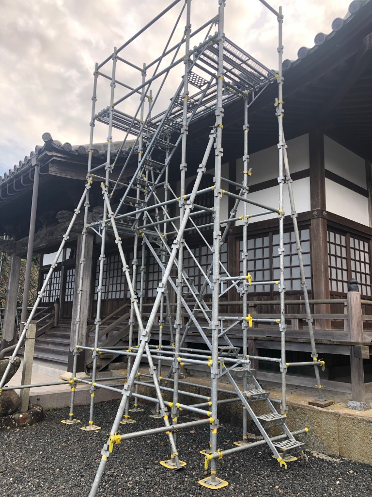 3時過ぎにお寺に帰ると、本堂の屋根に上がるための足場が組まれていました。