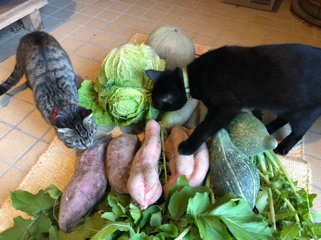 帰ってきて大根を水洗い。実りの秋を写真に撮ろうとしたら、ナモとタリが寄ってきました。
