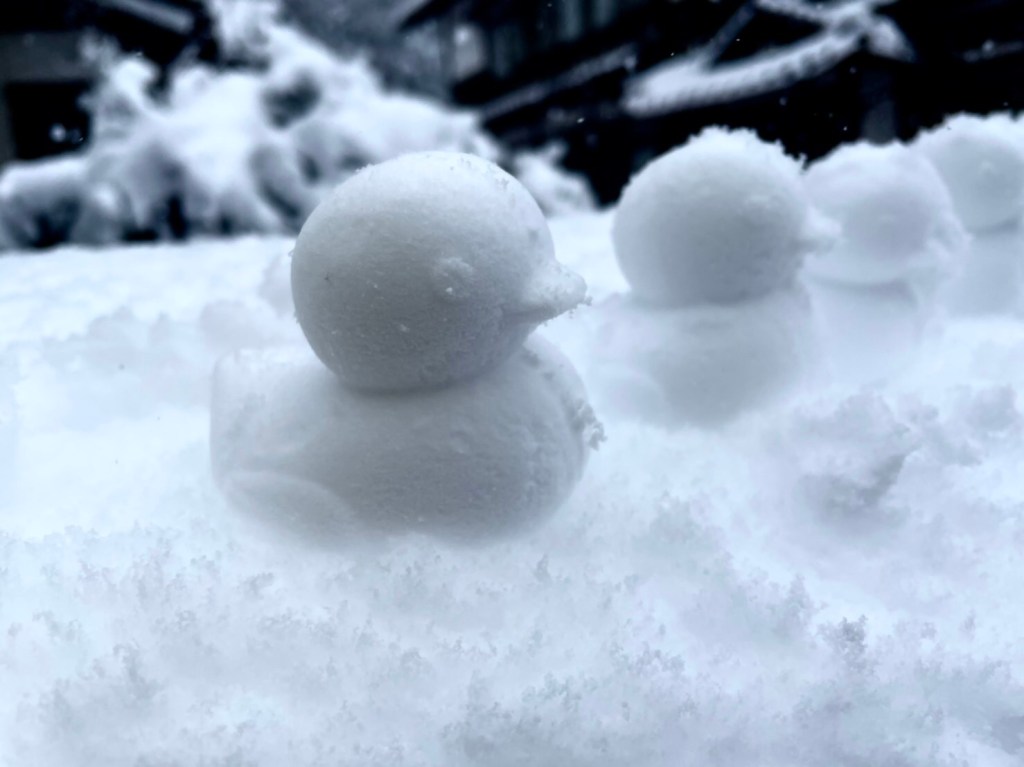 我が家の玄関先に白いアヒルの雪だるまが、たちどころに並びました。