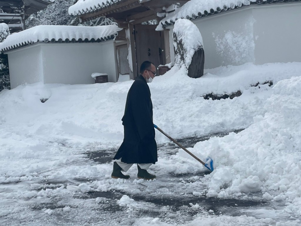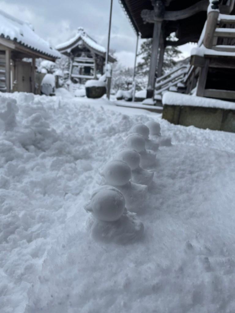 いったん家の外に出たら、雪かきをしないわけにいきません。隣の天台のお寺のおばさまも、情熱的にとりくんでおられましたので、シャベルを並べて道の雪をあけるのでした。