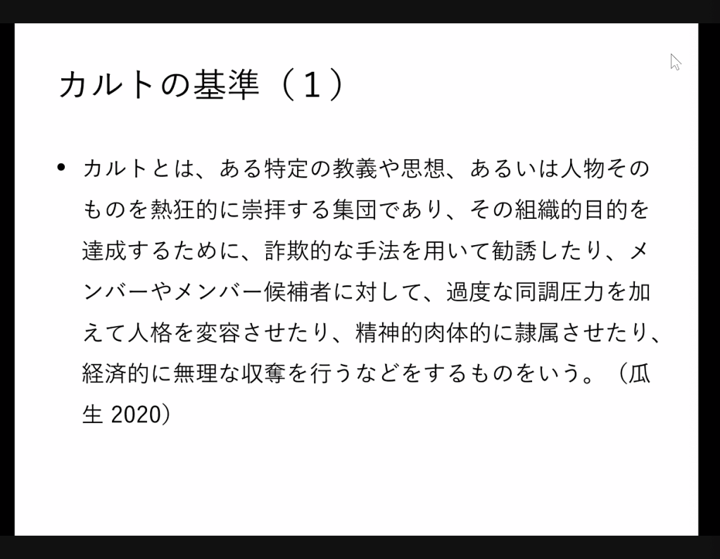 瓜生さんは、「詐欺的な手法を用いて勧誘したり、メンバーやメンバー候補者に対して、過度な同調圧力を加えて人格を変容させたり、精神的肉体的に隷属させたり、経済的に無理な収奪を行うなどをするもの」、これがカルトの基準であると強調されました。