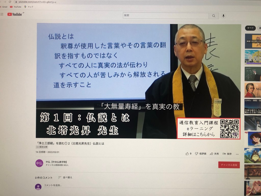 講義は①浄土三部経を読む、②正信偈を読む、の2つです。それぞれの講義は1時間(前半後半で分かれています)。今日は①を視聴しました。仏教の基礎知識がないと理解するのは容易ではないと思います。真宗僧侶で、あまり学べていないな、これではいけないなと感じている私のような者のための講義ではなかろうかと。生中継ではなく、録画配信ですから、字幕もついていて親切です。