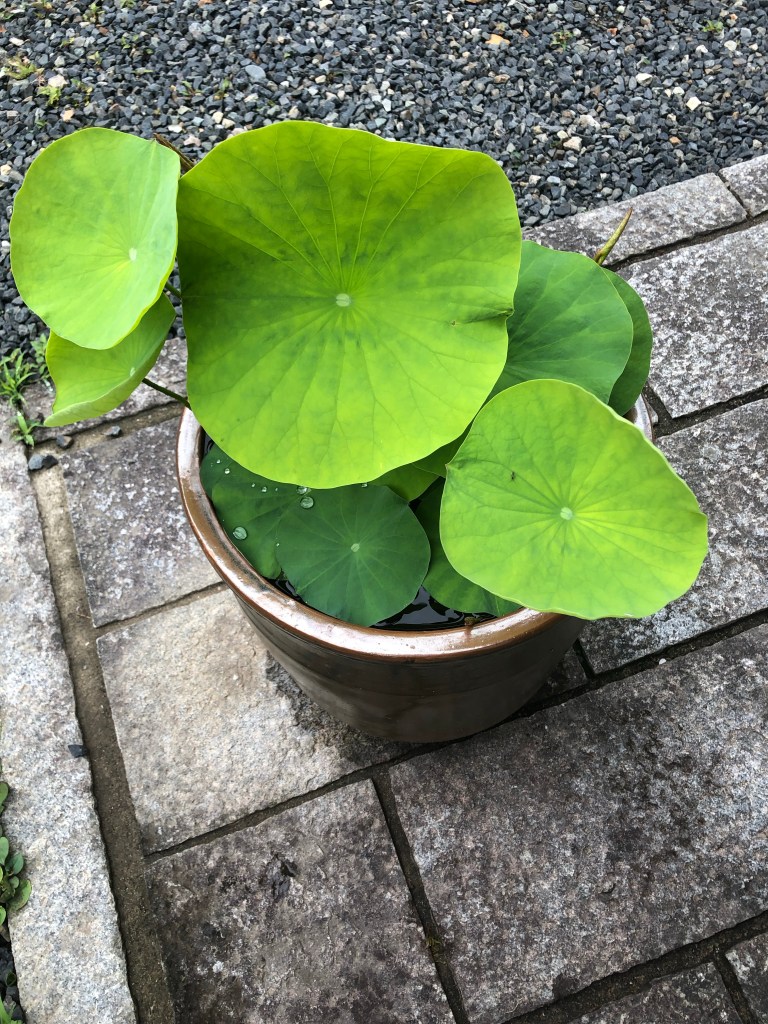 この数日、境内の蓮の鉢から茎と葉がぐんぐん伸びてきました。雨に降られても蓮の葉は露をはじいて濡れることがありません。これをロータス効果と呼ぶそうです。自然とは本当に不思議なものです。