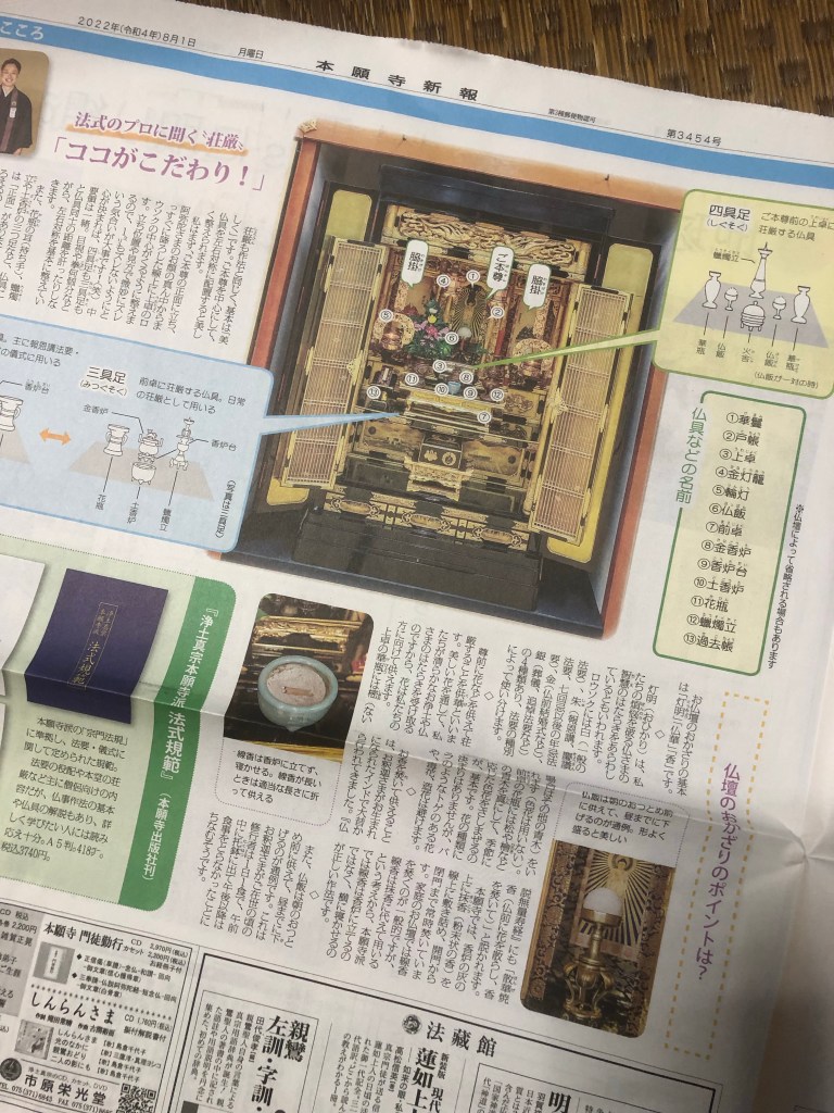 さて、作業がひと段落して「本願寺新報」を読んでいると、仏壇の飾り方についての説明がありました。読まれたご門徒さんは、びっくりするかもしれません。