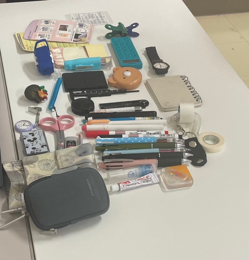 今日は会議の合間に「ポケットのなかみを見せて!」と突撃しました。机の上にのせていくと、出るわ出るわ。筆記用具やペンライトまでは予想できましたが、動けない患者さんのための道具も沢山入って、計40点!