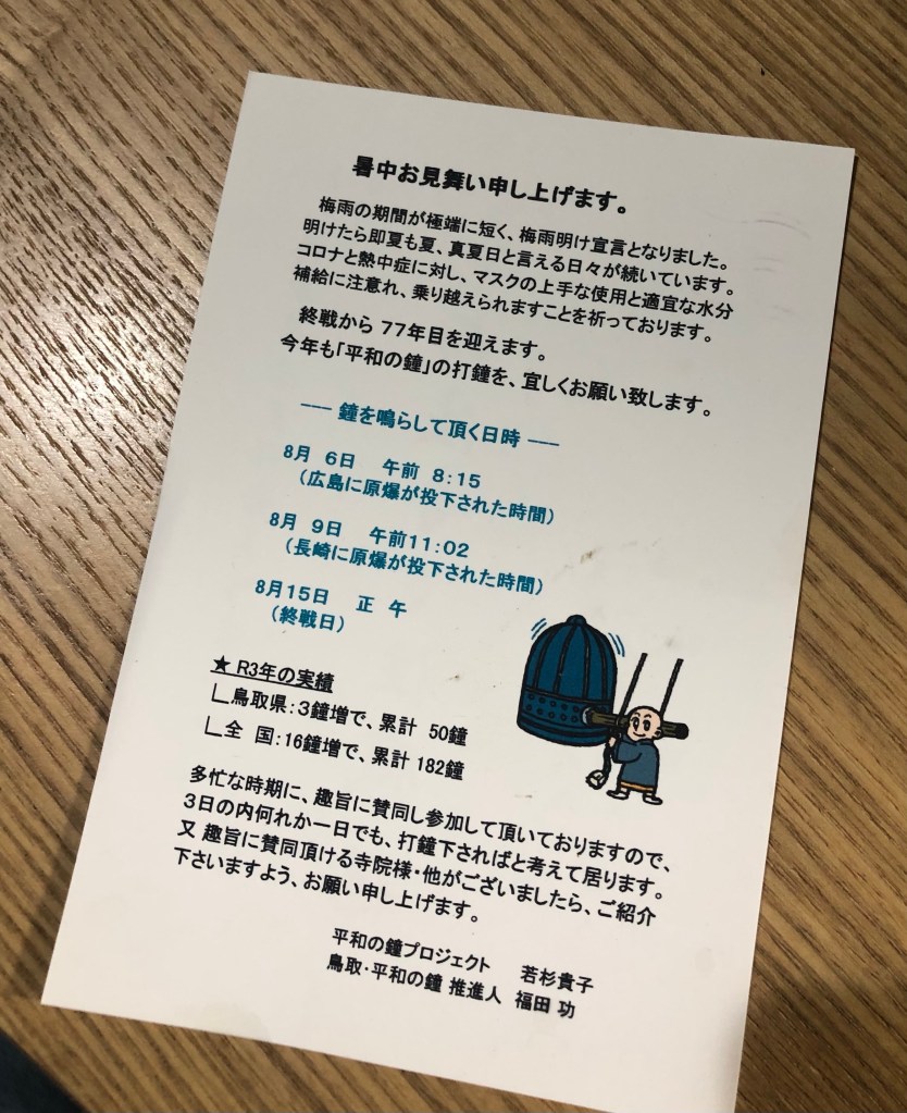 西法寺でも8月6日午前8時15分、9日11時2分、15日正午に鐘を打ちます。