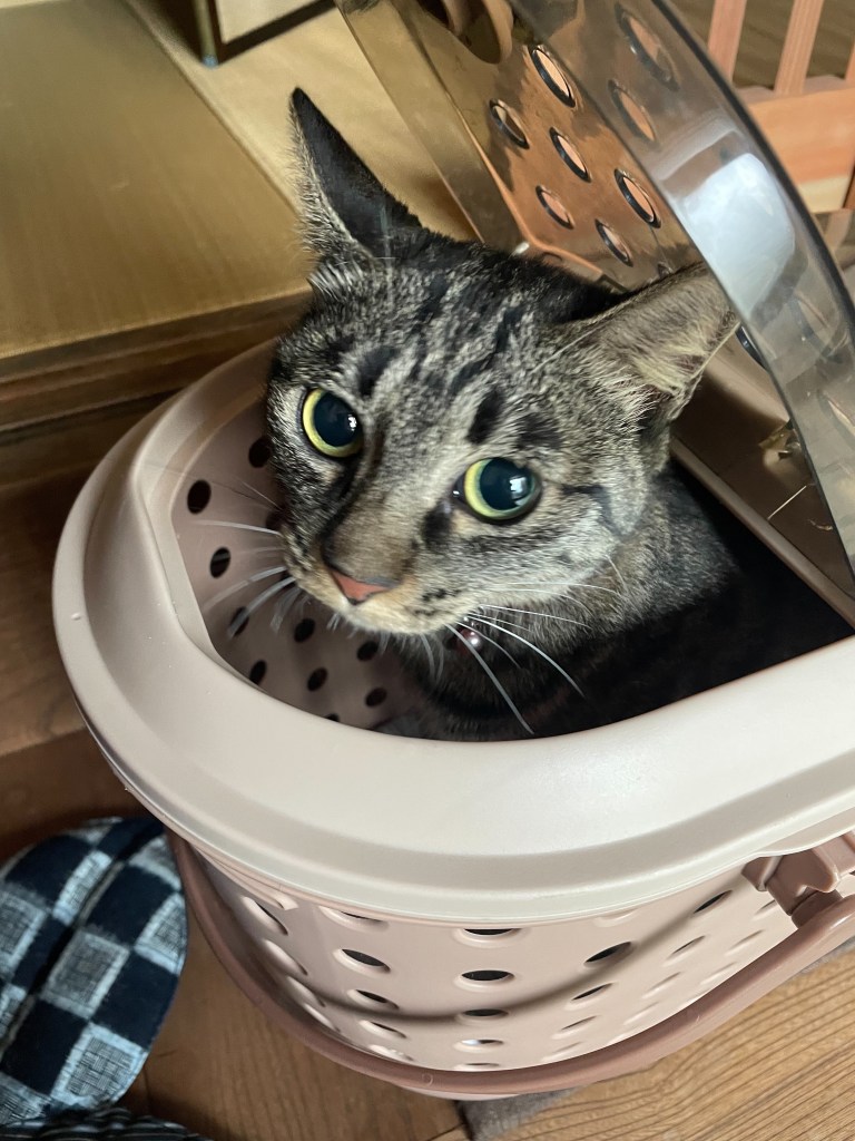 仕切り直して、カゴが玄関を出てから「ニャー!」「ニャー!」と悲しい声をあげ始めたナモちゃん。