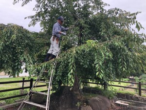 この3日ほど、植木屋さんに境内の剪定にきていただきました。最終日の今日は駐車場の桜を剪定。住職も枝ひろいのお手伝いです。