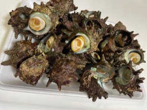 作業中、近所にお住まいのご門徒さんがこられ、「栄螺食べられんだか」と。朝、潜ってとってきたそうです。