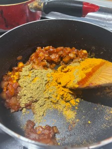 作り方:①みじんぎりにしたニンニクとショウガを油で炒めて香りを出す。②みじんぎりにしたタマネギを鍋に加えて、強火で飴色になるまで炒める。少々焦げても気にしない。③賽の目切りにしたトマトを鍋に加え、汁気がなくなるくらい炒める。④スパイスと塩を加え全体がまとまるよう炒めて完成!