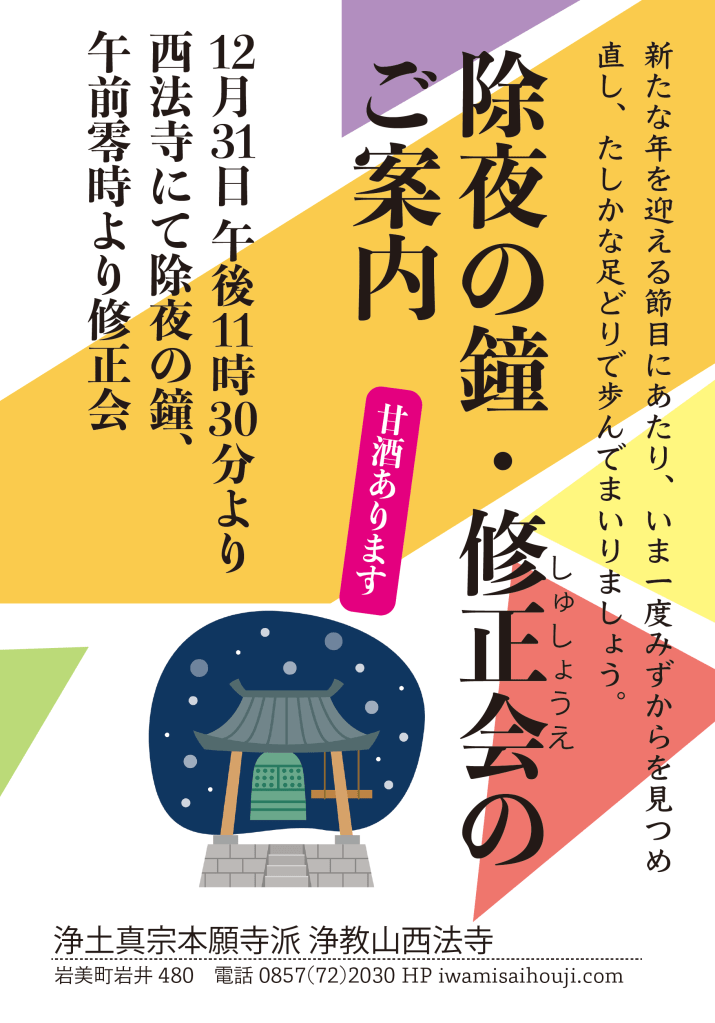 大晦日、午後11時30分より除夜の鐘をつきます。今年リニューアルした鐘撞堂でのはじめての除夜の鐘です。本堂では甘酒、お菓子など用意しております。年がかわって午前0時より、読経します。