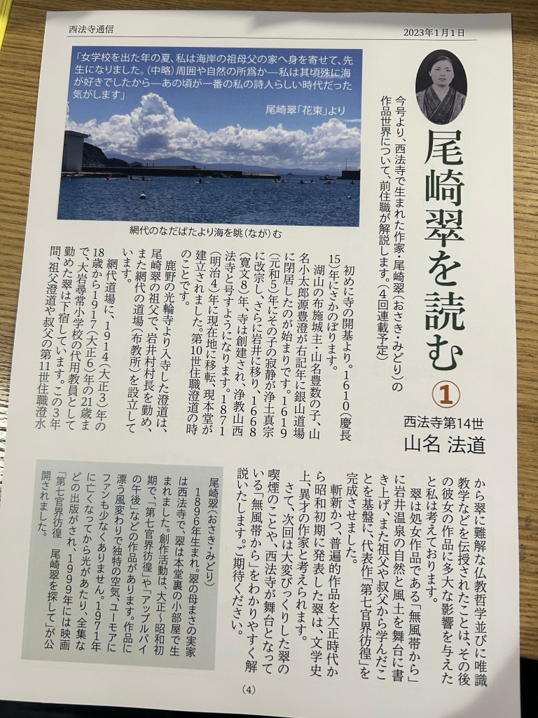 今号は2ページ増やして6ページになりました。前住職から「尾崎翠について連載したい」との話があり、4回連載する予定です。