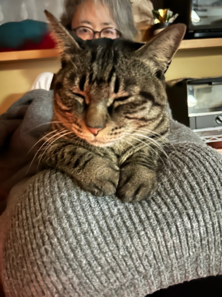 おばたんが、だいどころのおいすできゅうけいをはじめたので、おひざにとびあがって、いっしょにしゅとーぶにあたりましょう。