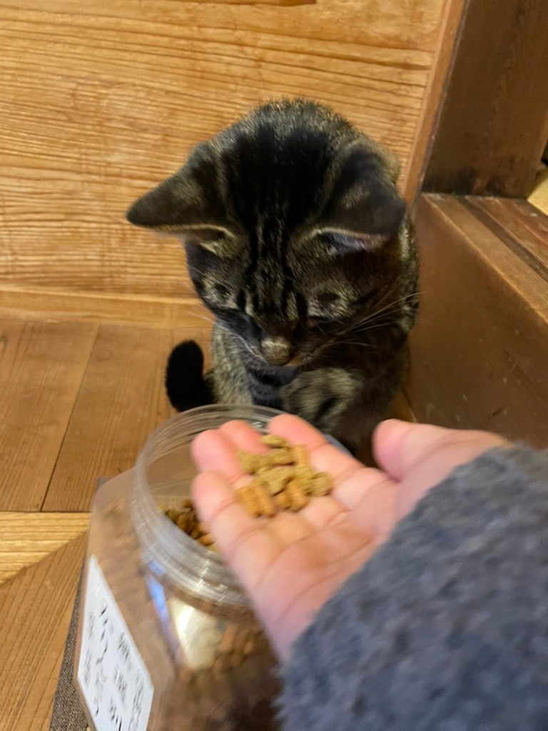 あたいは、シマちゃんがもらうカリカリ(おおきなふくろにはいった、おとくなきゃっとふーど)が、いちばんすきなので、シマちゃんがごはんをよばれるところを、じっとみていました。そしたら、おばたんが、ひとにぎり、シマちゃんのごはんをわけてくれました。これは、いつもとはちがうことでした。