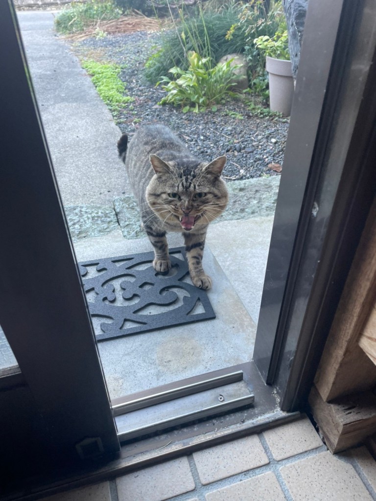 のらねこのシマちゃんは、いつものようにおげんかんのまえで「ニャーン!」と、おおごえでないて、おばたんがげんかんをあけたらまたいつものように「ハーッ」といいました。