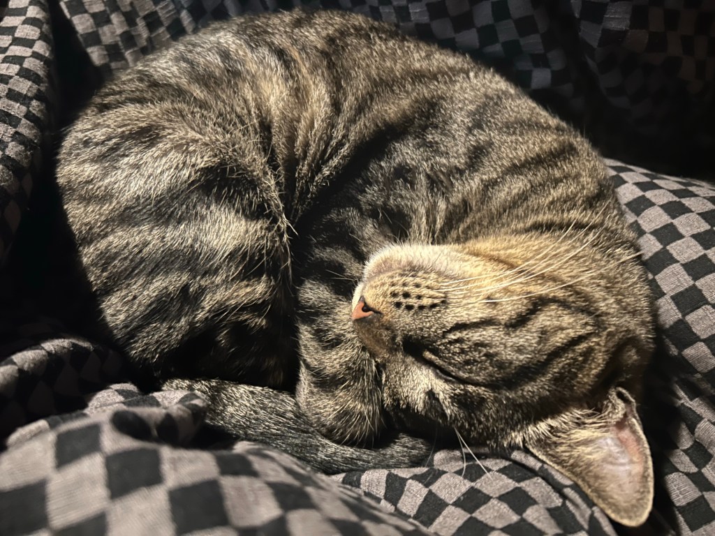 いまは、ふゆになったので、ばんは、おいたんかおばたんのおふとんのうえに、くぼみをつくってねています。ぬくぬくでねむりすぎるので、こないだは、ター坊もオンちゃんもおきたのに、あたいだけ、おふとんのなかで、ねぼすけでした。