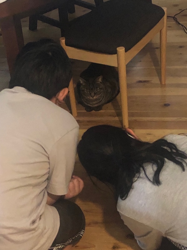 ナモの方は、最初、警戒してイスの下に隠れていたものの、優しい人たちだとわかったのでしょう。寄ってきて、背中を撫でさせてくれたり、Tくんからちゅーるをもらってよばれたりしていました。えらい!