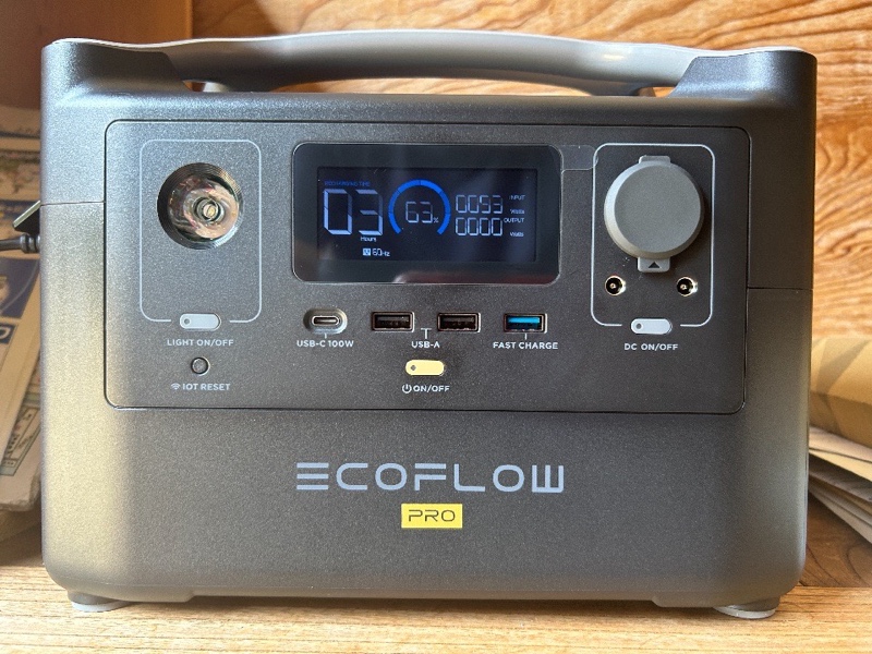 夕方4時現在、2時間半ほどつないでいますが、63%まで充電されています。ポータブル電源の容量は720Whとのこと。サーキュレーターなら15時間ほど稼働させることができそうです。