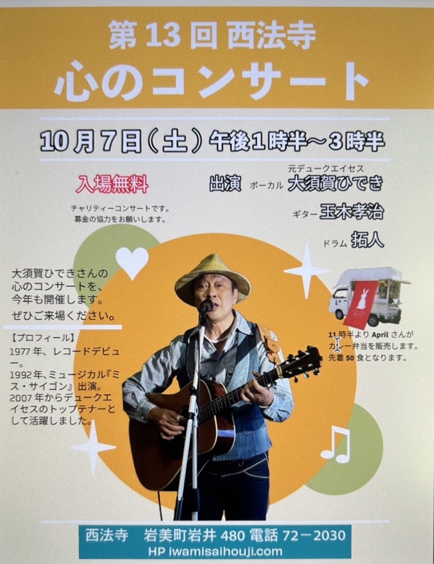 今日は早朝から始動しました。お勤めのあと、2時間ほどかけて10月7日の第13回「心のコンサート」のチラシづくりです。今日中には完成させて明日には印刷所に入稿する予定です。地元の岩井集落は全戸に、町内のご門徒さんにもお知らせしたいと思います。それから、お寺フェスでお世話になった鳥取医療生協の「健康まちづくり部」の方たちにも。