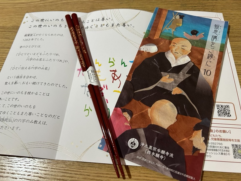 さて今年は親鸞聖人ご誕生850年の節目の年です。週末に本願寺から届いたリーフを町内のご門徒さんにお配りしようと思います。参拝された方にはささやかですが記念のお箸をプレゼントします。
