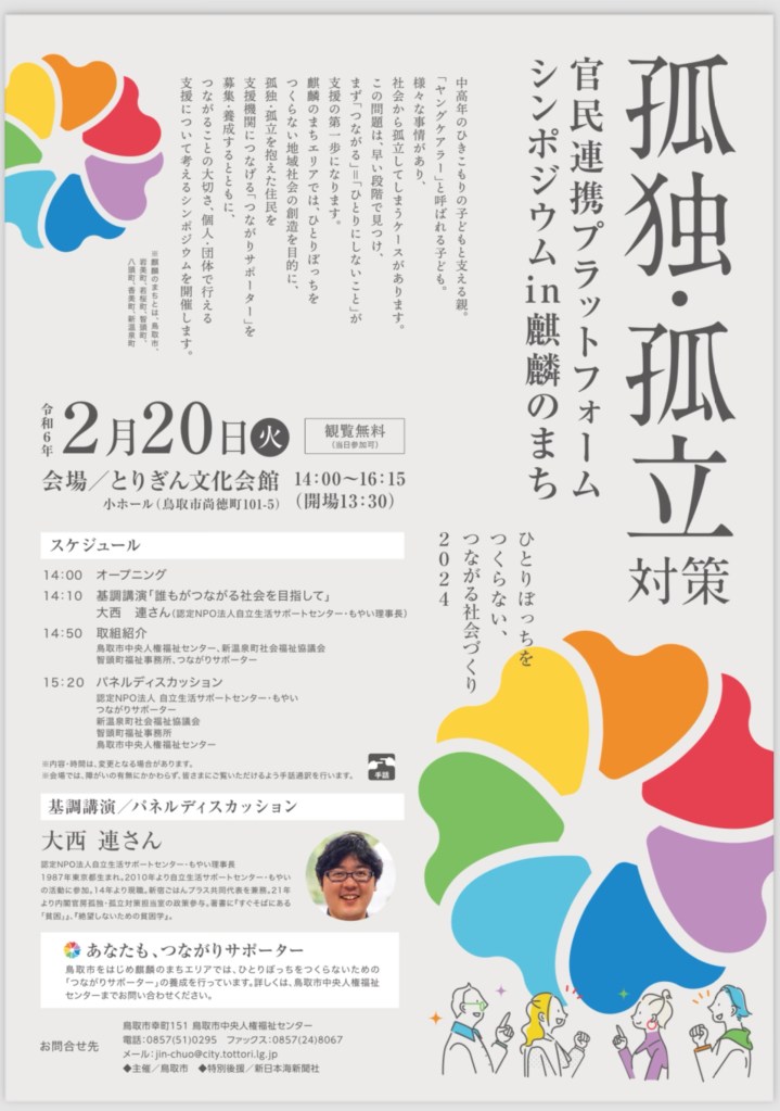 今日の午後、孤独・孤立対策シンポジウムに参加しました。大西連さん(NPOもやい理事長 内閣官房孤独・孤立対策担当室・政策参与)の基調報告、それを受けて4人が活動を発言。