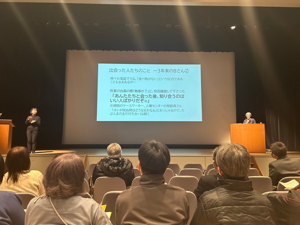 鳥取医療生協につとめる坊守は、食糧無料市のとりくみについて発言しました。出かけていくことで声なき声をつかんで、支援につなげてきた経験談です。私の隣に座っていたおそらく公務員の方が、「知らないだけで、こんな活動があったんだなぁ」とうなっておられました。